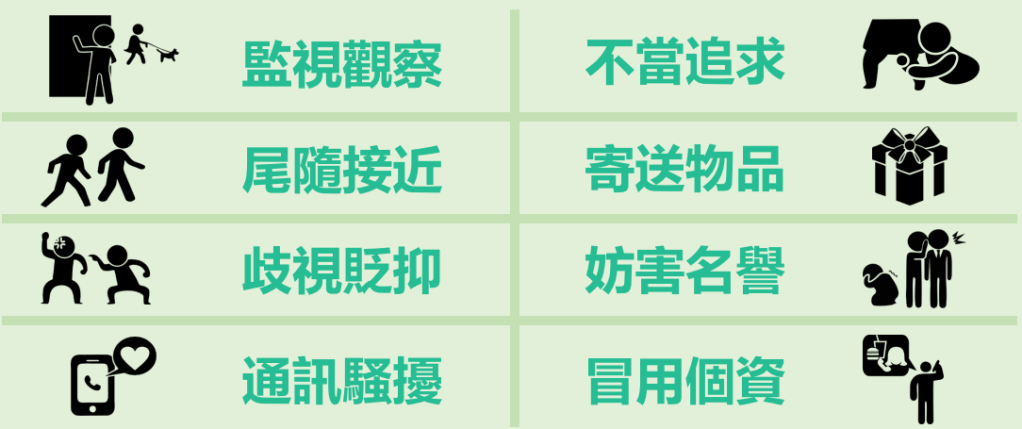 其中第3條也明確說明「跟蹤騷擾行為」的定義,指以人員、車輛、工具、設備、電子通訊、網際網路或其他方法,對特定人反覆或持續為違反其意願且與性或性別有關的行為,使之心生畏怖,足以影響其日常生活或社會活動。行為被列舉分為八類: