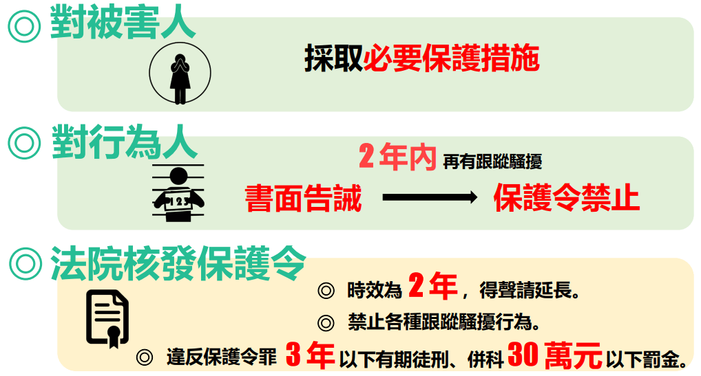 過去警方面對跟蹤騷擾行為時,大多以《社會秩序維護法》第89條「無正當理由,跟追他人,經勸阻不聽者」的規定,處3000元的罰鍰或申誡;其中如果要件符合「性侵害犯罪以外,對他人實施違反其意願而與性或性別有關之行為。(後續有損人格尊嚴或使其心生畏怖)」那就有可能以《性騷擾防治法》論處;最後如果再將條件限縮一下,家庭成員與恐怖情人的前提下,還可依照《家庭暴力防治法》向法院聲請保護令,避免加害者再次接近被害人。然而以上這三部法律的保障似乎存在著死角?