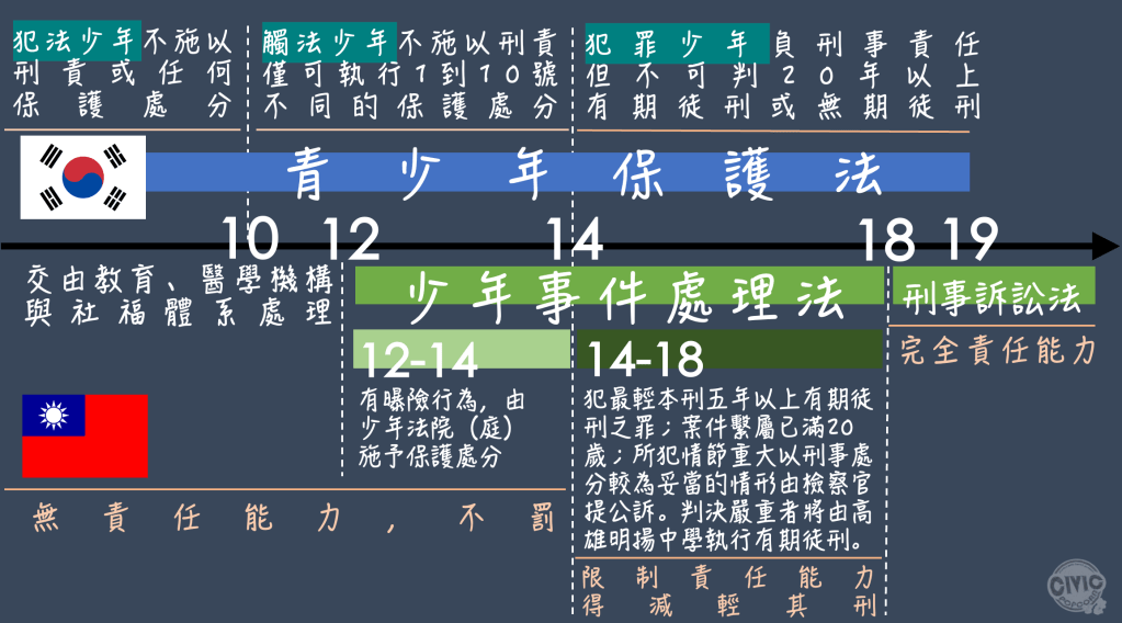 根據南韓《少年法》,未滿19歲者不可判20年以上有期徒刑或無期徒刑,而未滿14歲者不可起訴、判刑入監,只可執行1到10號不同的保護處分,其中以10號處分「感化機關收容兩年」最為嚴重,因此沈恩錫法官的地下頭銜「10恩錫」才讓所有犯罪少年膽戰心驚。這項規定是為了保護心智年齡尚未成熟的未成年人,以鼓勵和輔導的方式代替訓誡和處罰,而台灣對少年的觸法行為也有相關規定,只是與南韓不同之處如下: