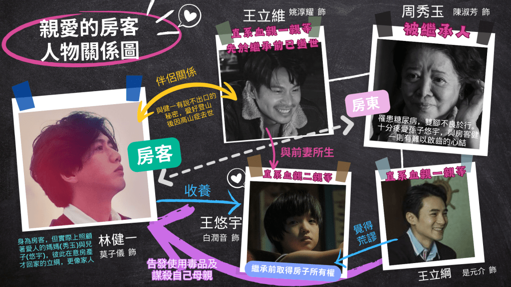高中公民法律單元中讓大家印象深刻(可能也是最煩人的)就理解《民法》的繼承關係,包含剩餘財產分配以及應繼份與特留份的計算。跟舊課綱相比,108課綱多數版本並未著墨於親權,直接從私有財產權的概念接續教大家繼承制度,也讓一些老師‘’總覺得‘’要額外補充親權的結構,如此《民法》繼承好像才比較完整。加上近年對法律修正、同婚專法的保障下,我國現行的親權與繼承制度是否像舊課綱一樣複雜?這部國片《親愛的房客》用最溫暖的節奏,絲絲入扣把這些議題一次呈現給觀眾思考:法入家門只是基礎,愛屋及烏才是本質。