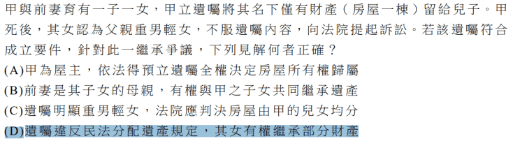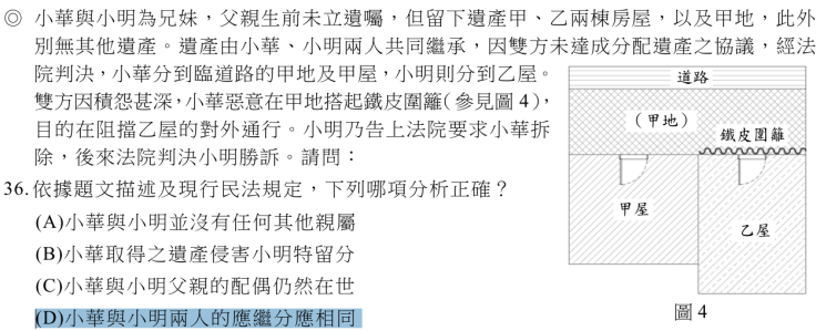 題目來源:大考中心 /上方為112年,社會科學力測驗,下方為112年公民與社會科-分科測驗有考到《民法》繼承相關的題目: