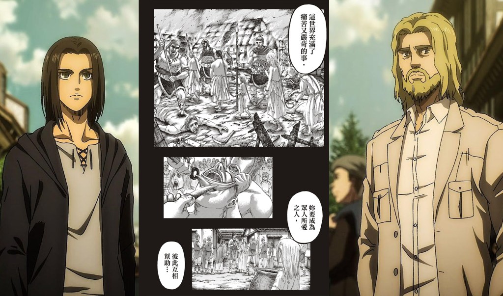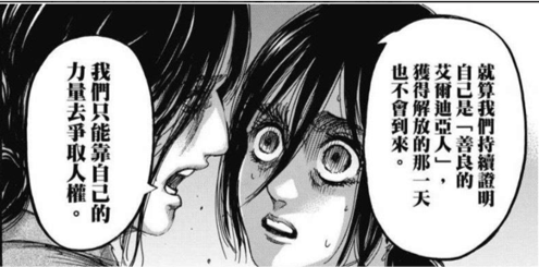 我們沒有辦法輕易判定,劇中的角色誰是好人誰是壞人,我想這也是練山創老師想帶給讀者的一種視角,也有可能是這部神作最重要的核心價值。我們對於善惡之分的標準是什麼?有沒有可能自己認為的『善』,其實在他人眼中是代表著『惡』呢?若是如此,解決辦法是發動地鳴嗎?還是有其他取得共識的管道?