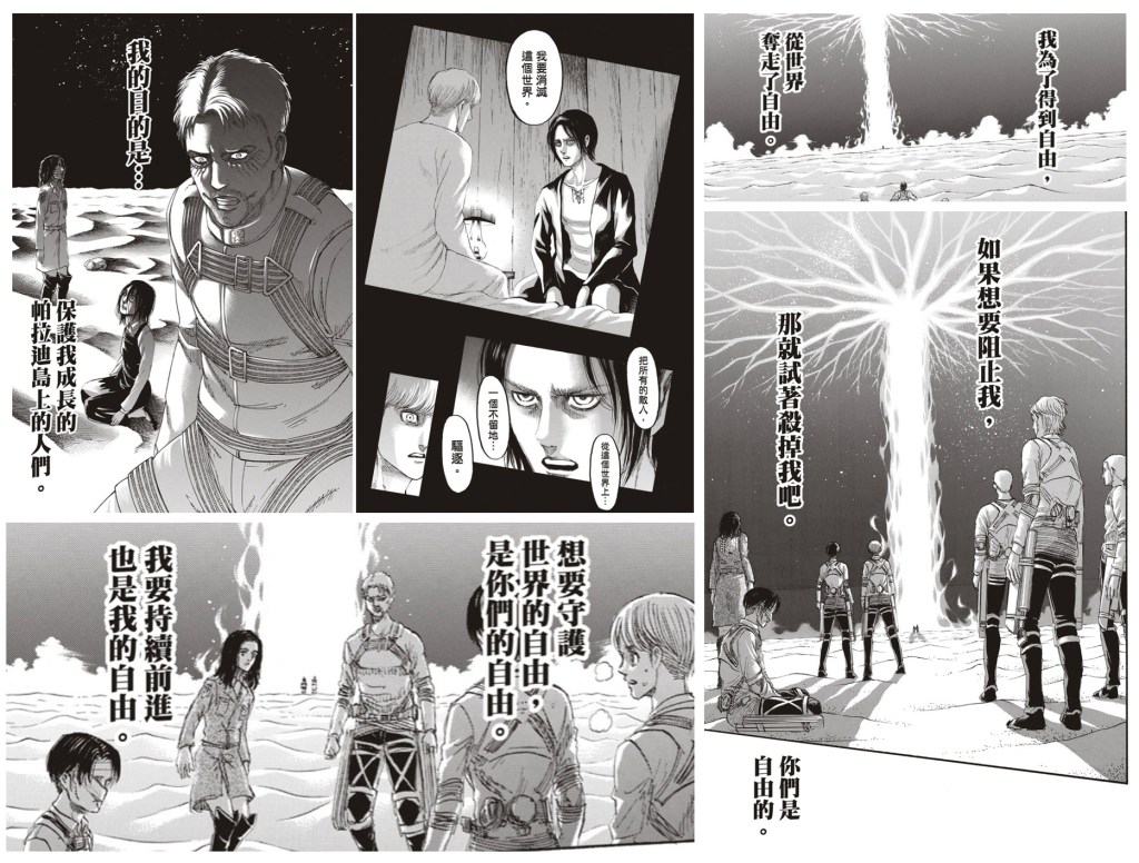初探進擊的巨人的宇宙觀,就有如初次見到高牆的帕拉迪島人民,就算我們想辦法進一步了解,可能都難用與練山創老師百分之百相同的視角去看待這部神作。我只相信無論後世是用什麼角度切入討論,或是故事留在我們閱聽人的心中的感動是什麼?而這樣多元的閱讀與視聽效果,或許也是一種『自由』吧。