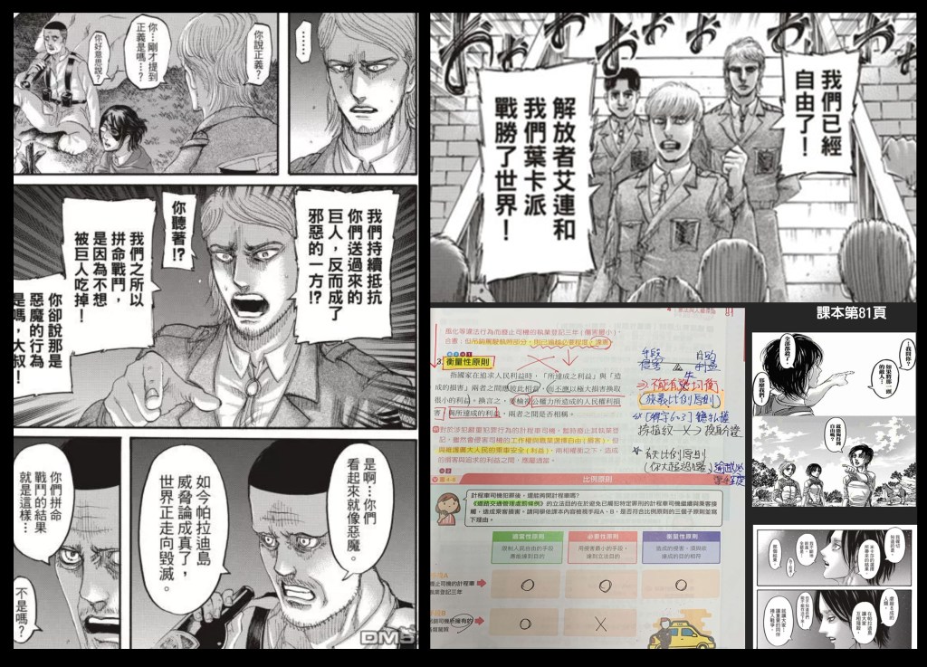《進擊的巨人》是日本漫畫家諫山創創作的漫畫作品(2009~2021),改編動畫於2013年播出,一播就是十年,因此在2023年第四季動畫播畢這天,才有人說這是自己與十年的青春回憶告別。當然收視時間拉這麼長的動漫,還要扣緊全球收視觀眾的心,確實不簡單。但真正讓我覺得厲害的是,《進擊的巨人》的世界觀與劇情,剛好讓我在公民教育的備課路上有所幫助,學生覺得有趣,我也講得開心。