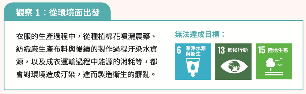 若以聯合國的「2030永續發展目標」(Sustainable Development Goals, SDGs)探討"快時尚"產業的運作模式,我們可以從以下觀點切入:
