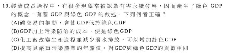 那些標價親民的服飾,背後可能需要承擔的成本相當龐大,或許透過GDP可以衡量"快時尚"的產值,但應該很少有政府部門願意以綠色GDP來衡量"快時尚"的價值。至少學測考古題有出現過XD